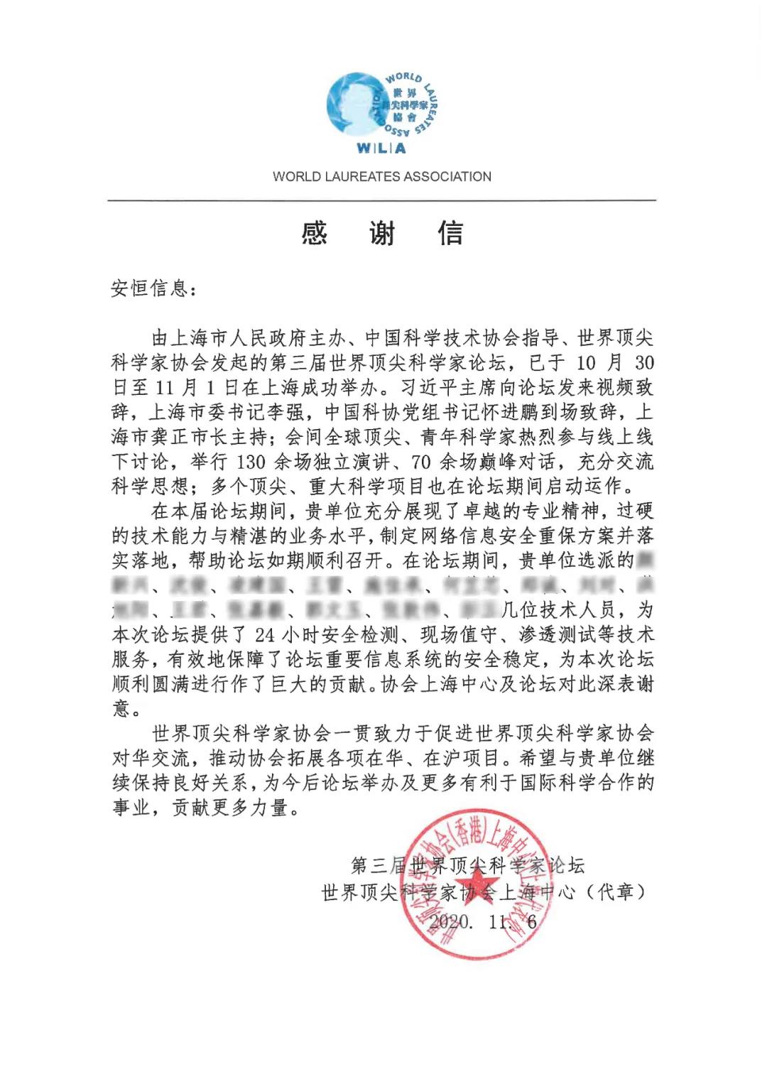 世界顶尖科学家论坛发来感谢信,点赞安恒人