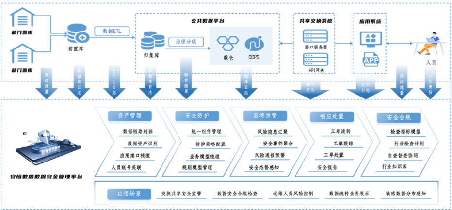从数据、接口、人员三个视角建立规则模型,对数据归集、处理、共享、交换场景下的数据风险进行全域治理和合规监管,对发现的数据安全风险进行及时预警和通报,建立适应数据动态流动的安全管控机制。以平台为基础工具,可以建立数据层面从【资产识别】→【安全防护】→【监测预警】→【响应处置】→【安全合规】的数据安全监督管控闭环。