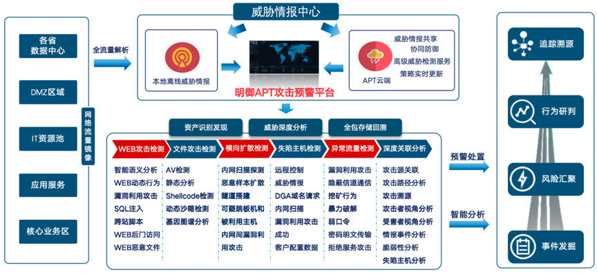 明御APT攻击预警平台基于丰富的特征库、全面的检测策略、精准的深度分析模型、高效的沙箱动态分析,结合智能机器学习和云端威胁情报,实时对网络流量进行分析,能够对流量中的各类威胁产生告警,实时发现用户网络中的各种已知和未知威胁,并通过大屏、分析模型进行可视化展示。